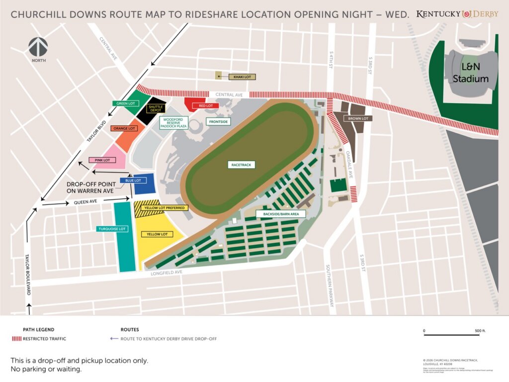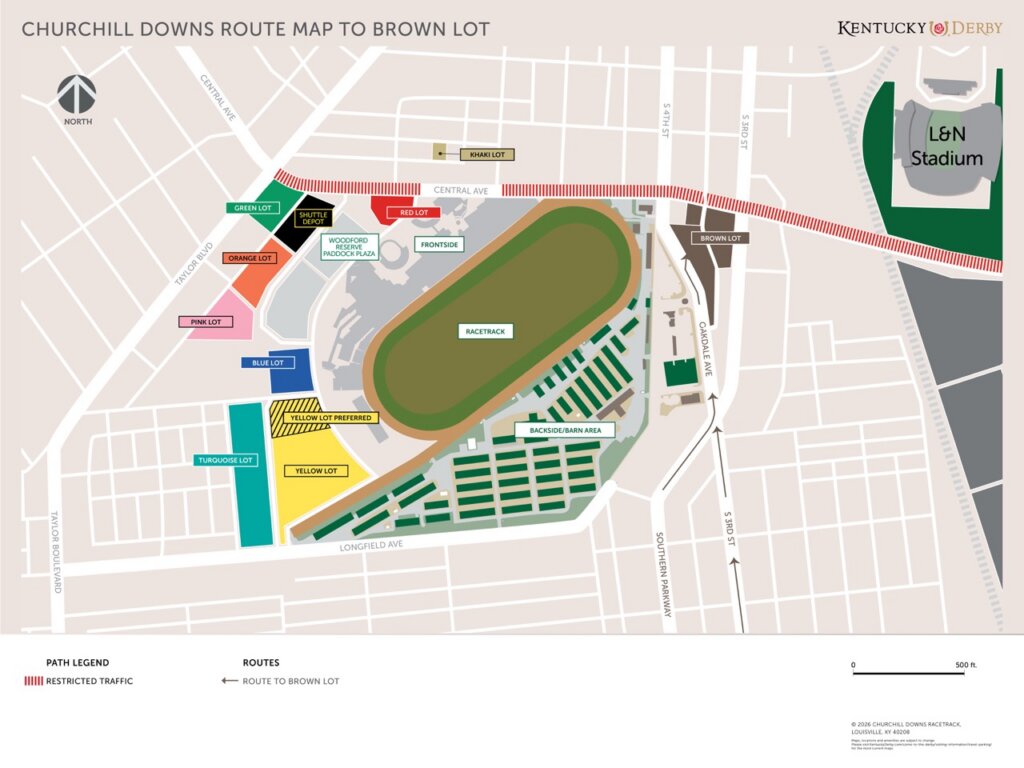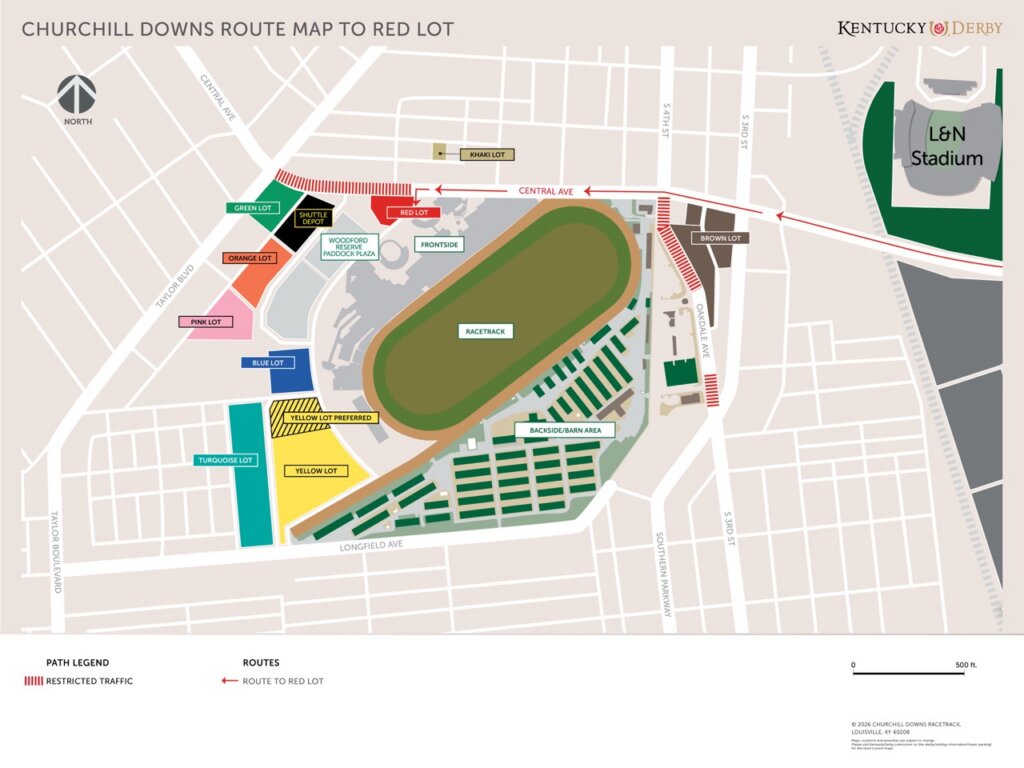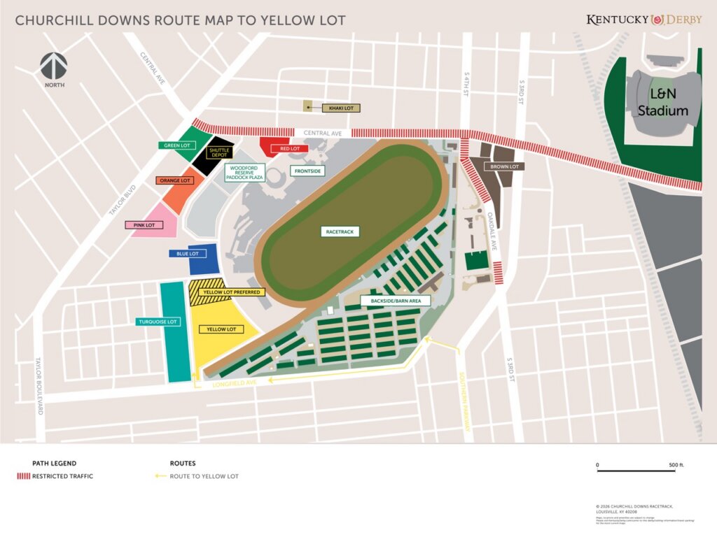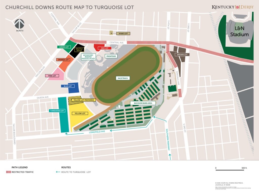 All onsite parking at Churchill Downs is reserved in advance and available for pre-purchase as long as inventory is available. Parking within each reserved lot is first-come, first-served including ADA spaces. If you do not have pre-purchased parking, you will not be able to purchase it onsite. Please pay careful attention to your specific lot’s instructions for parking and be sure you understand the directions as entry for each lot is unique. See the above parking map directions for more information.