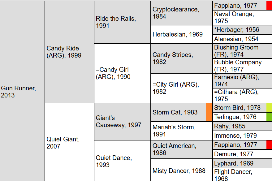 Ottinho and Pretty Ana count as half-siblings to Gun Runner because they share the same mother. Quiet Giant, a well-bred daughter of “Iron Horse” Giant’s Causeway, is herself a half-sister to 2005 Horse of the Year Saint Liam.