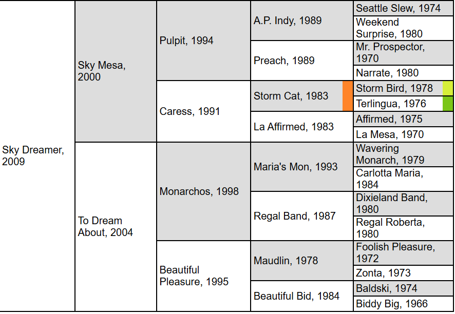 Sky Mesa was produced by Caress, a multiple Grade 3 winner on the turf. She defeated males, notably Irish classic winner Fourstars Allstar, in the 1995 Poker (G3). In her prior start, she romped in the Just a Game S. in then-record time for a mile on Belmont Park’s Widener turf course.