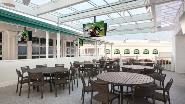 See and be seen at the famous Turf Club. Typically a members-only club during the race meet, this exclusive premium dining space features a party atmosphere with live entertainment, a bourbon bar, and an interactive Chef’s kitchen including a brick oven and gelato station. Two covered outdoor dining options include the Turf Club Balcony, facing the Paddock, and the Turf Terrace, facing the track.